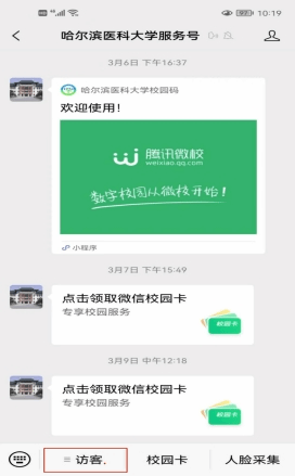 2、进入“哈尔滨医科大学服务号”,点击“访客”后点击“访客审批”,如下图所示。