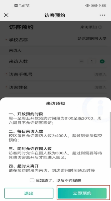 3.查看“来访须知”,点击“立即预约”,如下图所示。