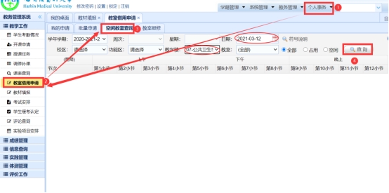 1、点击“教室借用申请”菜单,进入“空闲教室查询”窗口,选择相应条件后点击“查询”按钮(注:必须选择日期或周次星期其中一种后再查询,否则无法显示数据)