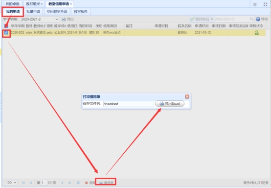 进入“我的申请”窗口,选择申请信息后点击底部“借用单”按钮进行导出打印