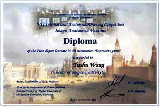 2021年12月1日,赛切诺夫大学举办的”VESALIUS“第七届国际解剖学绘画年度比赛在俄罗斯莫斯科举行。此次解剖学绘画大赛有来自俄罗斯、中国、美国、德国、阿塞拜疆、保加利亚、吉尔吉斯等全球不同国家的近300幅入选作品参赛。