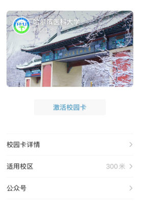 第一步:使用微信扫描下方二维码,进入哈尔滨医科大学服务号。按照提示领取电子校园卡。