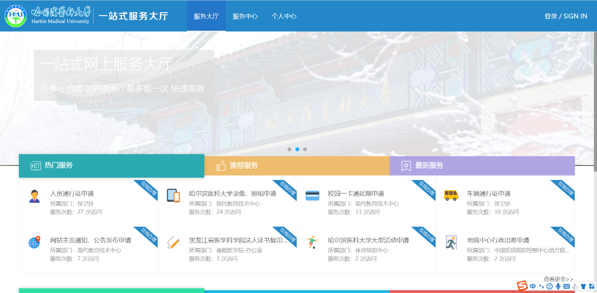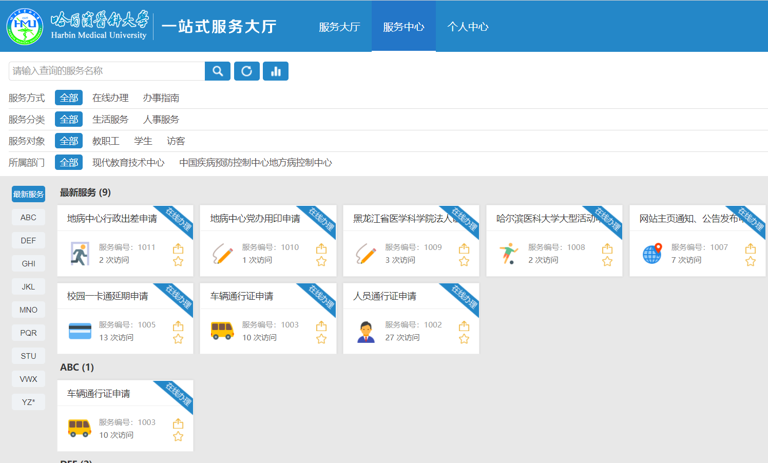 为了优化校务服务,有效提升学校治理能力,按照教育厅《推进高校校务服务“一网、一门、一次”改革实施方案通知》的要求,现代教育技术中心组织建设了哈医大网上办事大厅。通过前期对各单位服务事项进行调研,现已有部分业务建设完成,请各单位测试本部门业务设置是否合理,具体方式如下:
