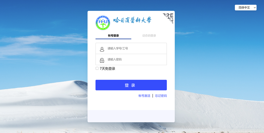 在浏览器中输入统一身份认证网址:https://authserver.hrbmu.edu.cn/authserver,进入统一身份认证登录界面,点击账号激活按钮。